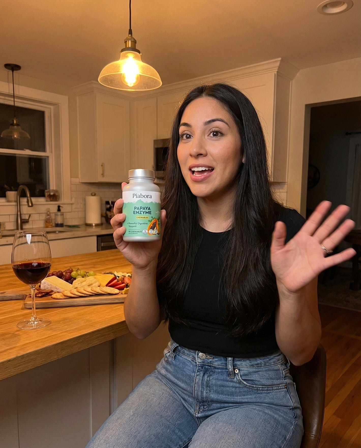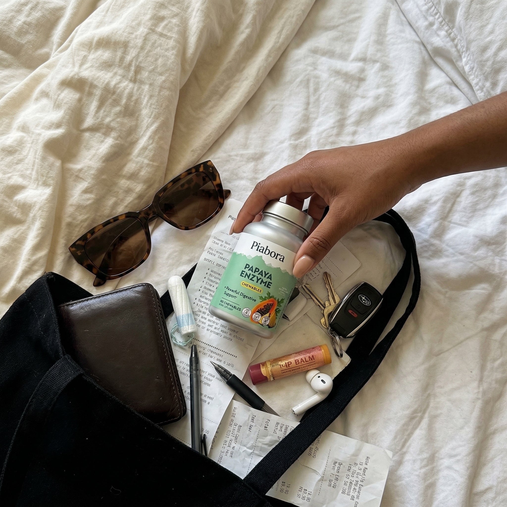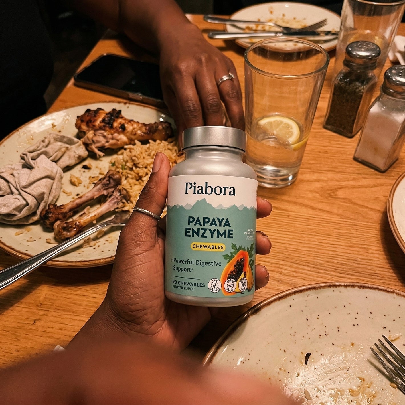 Papain (100,000 FCC PU — the main digestive enzyme from papaya), Amylase (breaks down starches), Protease (breaks down protein), Bromelain (from pineapple — breaks down protein and supports comfort), and Papaya Fruit. Natural pineapple flavor. Sweetened with xylitol and stevia. Vegan. Gluten-free. Lab verified. No added sugar.